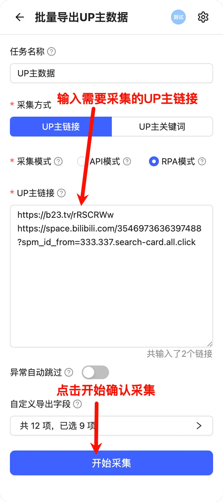 必填输入需要采集的UP主链接,支持批量输入多个链接。