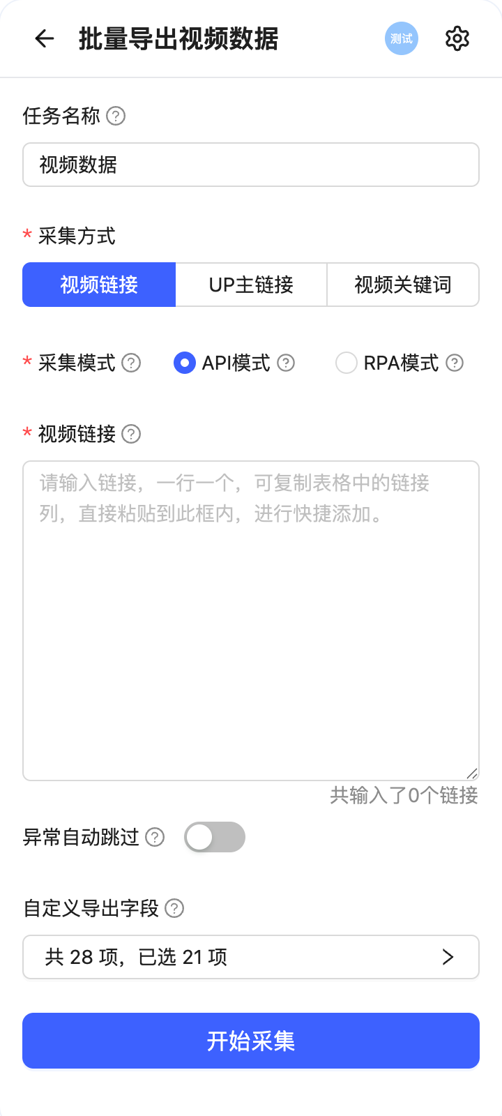 必填输入需要采集的视频链接,支持批量输入多个链接。