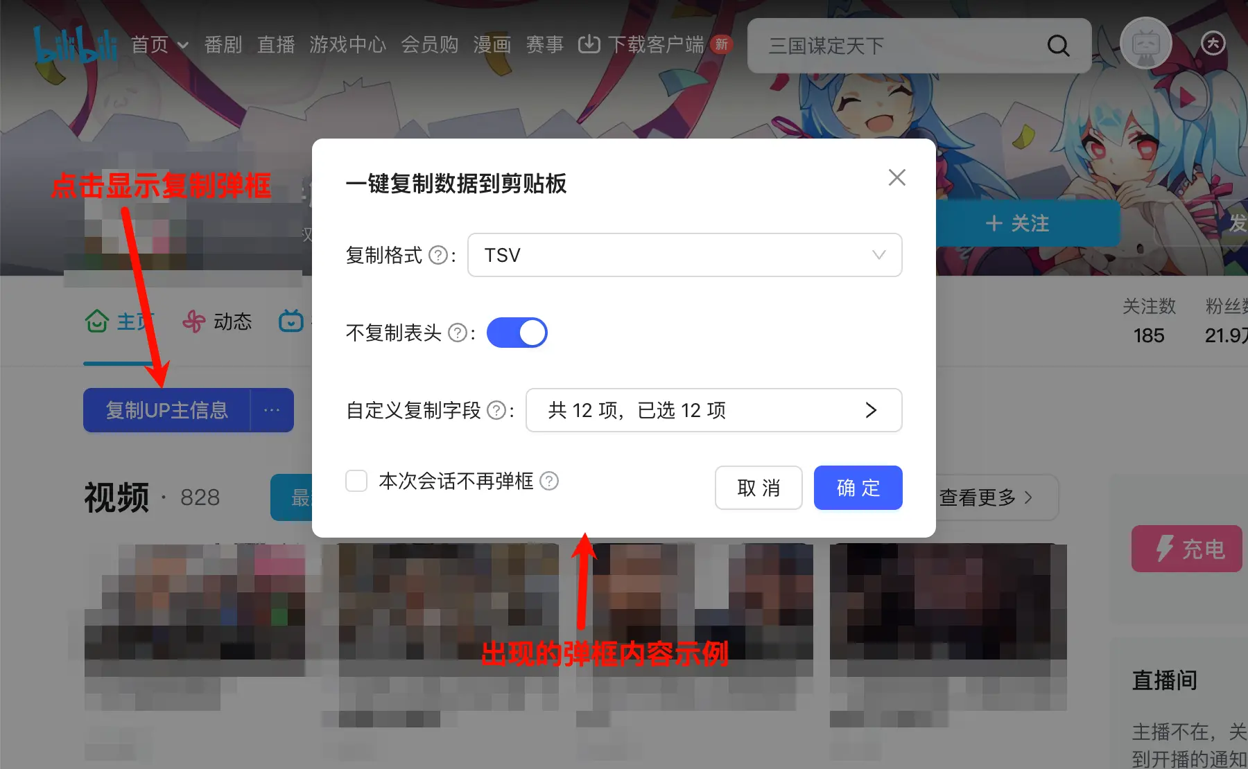 点击复制UP主信息按钮,会出现弹窗,具体说明请参考便捷复制数据。