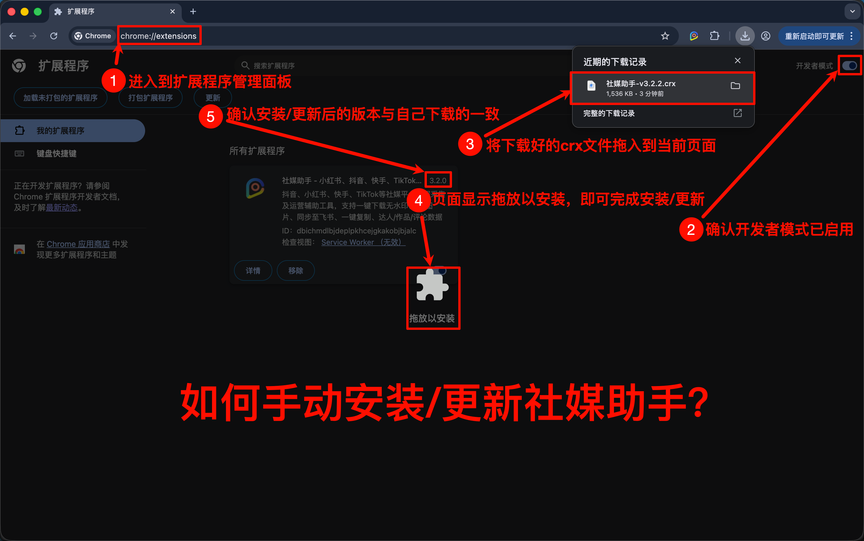 下载新版本的 .crx 文件,按照首次安装的步骤拖入浏览器即可自动覆盖更新,无需手动卸载旧版本。
