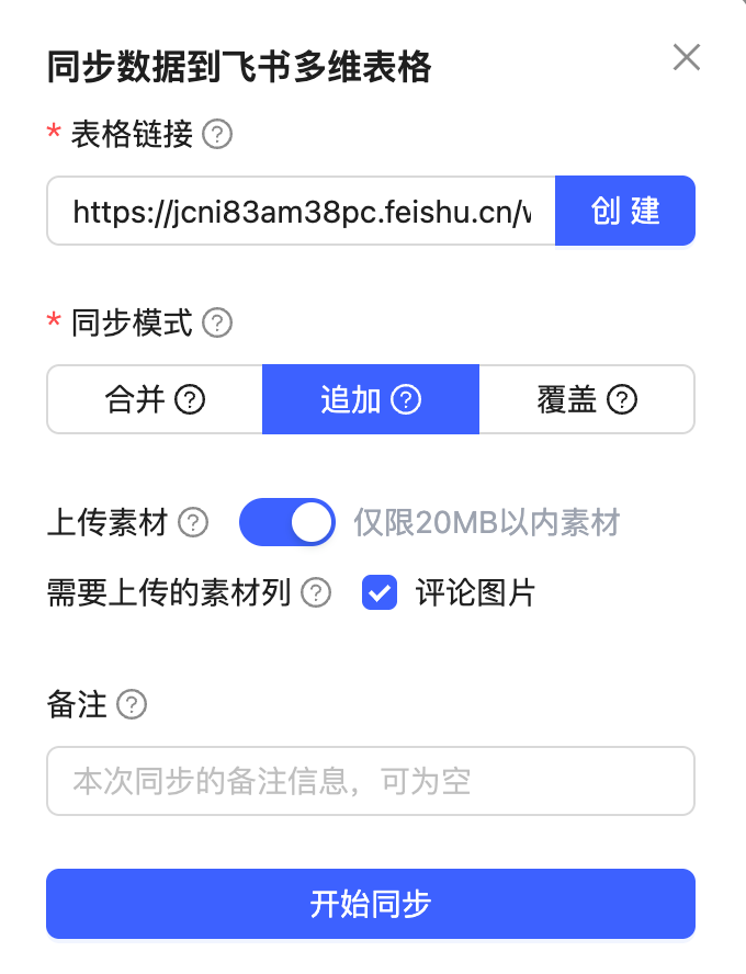 社媒助手飞书同步功能可将采集数据一键传输至飞书多维表格,支持追加、覆盖、合并模式及图片上传。